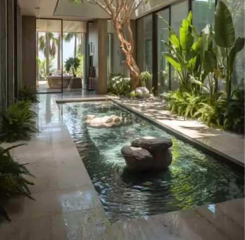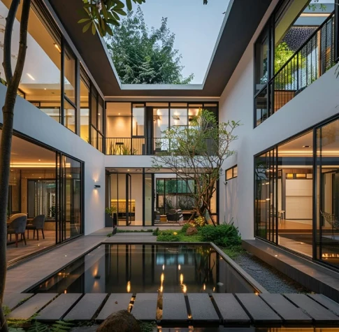 Courtyards, verandahs, and semi‑open spaces act as breathing zones within homes. They enhance natural ventilation, daylight, and create a strong indoor‑outdoor relationship.