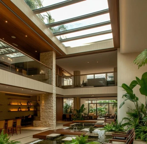 Light is treated as a design material. Skylights, large openings, filtered daylight, and shading devices enhance spatial experience throughout the day.